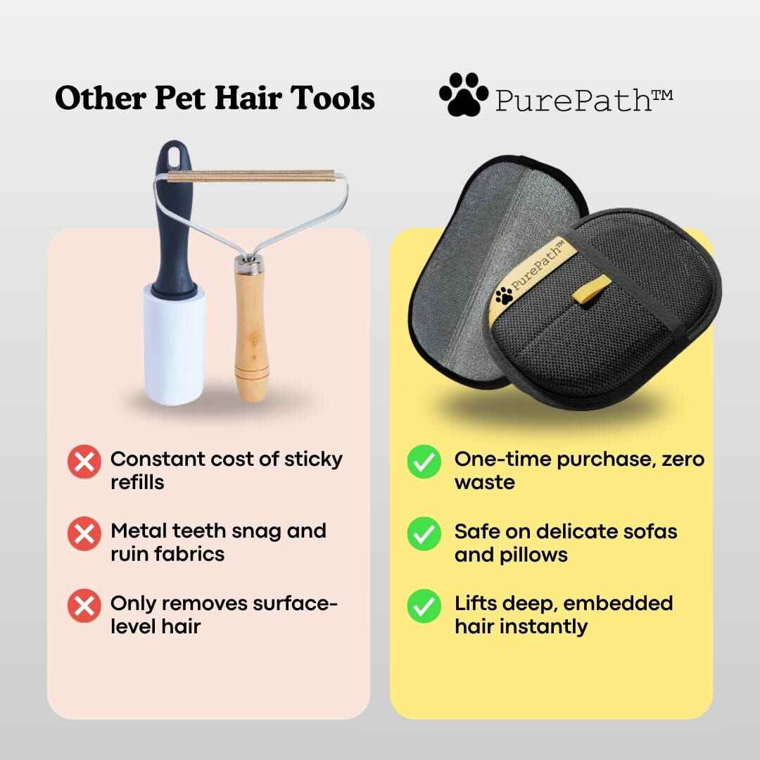 The PurePath Glove is built for real, daily pet homes: dense 5 mm electrostatic mesh that actually pulls hair out of fabric, reinforced stress points so it doesn’t rip, waterproof edges for quick rinsing, and a 60‑day money‑back guarantee if it doesn’t outperform the cheap ones.